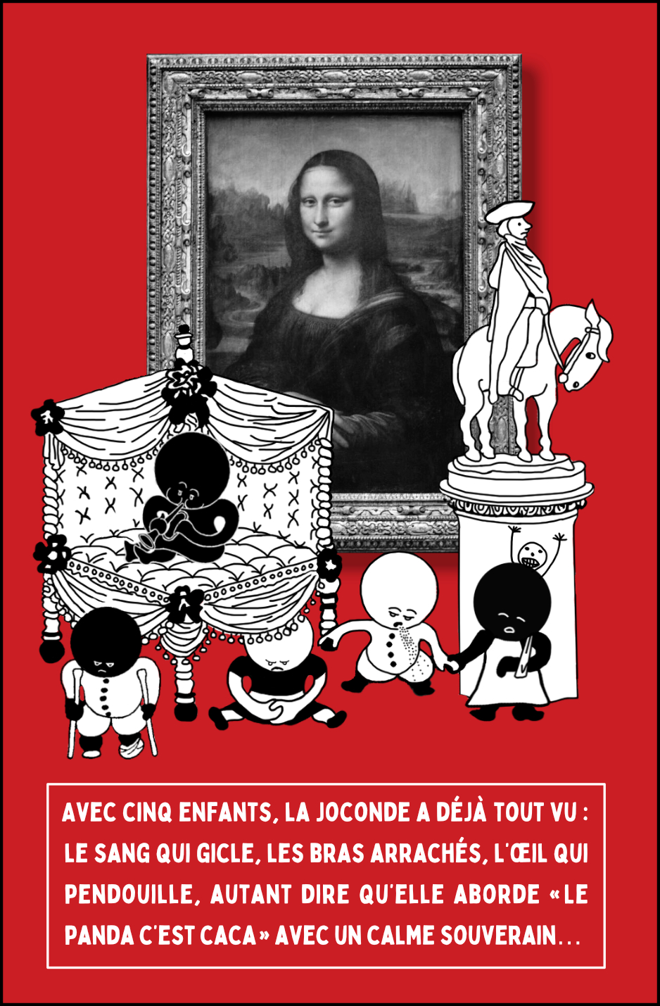 Et comme vous le savez, aux Mutins de Pangée, on ne lésine jamais pour nos lecteurs. Alors on a pioché, sans vergogne, dans les plus beaux chefs-d'œuvre de l'histoire de l'art, même s'ils n'ont pas été faits pour des enfants. On n'allait quand même pas s'arrêter à ce genre de détails ! Un chapitre d'À la recherche du temps perdu de Marcel Proust se métamorphose en fable animalière. Jonathan Swift (celui des Modestes propositions pas des Voyages de Gulliver) vient à la rescousse pour aider le lecteur à sauver la planète. Marcel Duchamp retrouve La Joconde pour vérifier si, toujours, elle H.O.O.Q. Et pour la couverture, nous n'avons pas hésité une seconde à nous adresser au meilleur, l'enlumineur de quatre rois de France, Jean Bourdichon (XVI°). Mais plus essentiel que tout, un temps calme est offert au lecteur au milieu du livre.